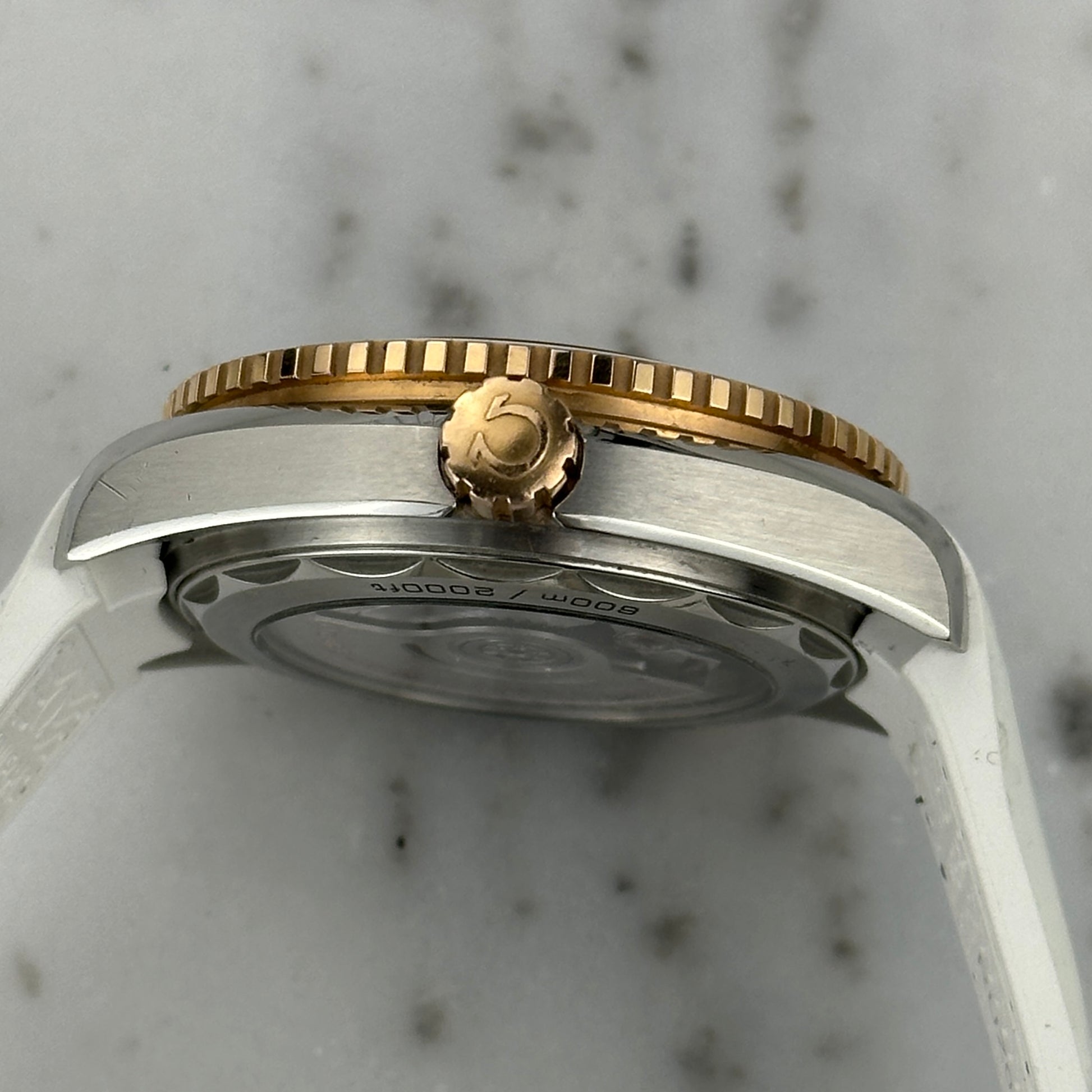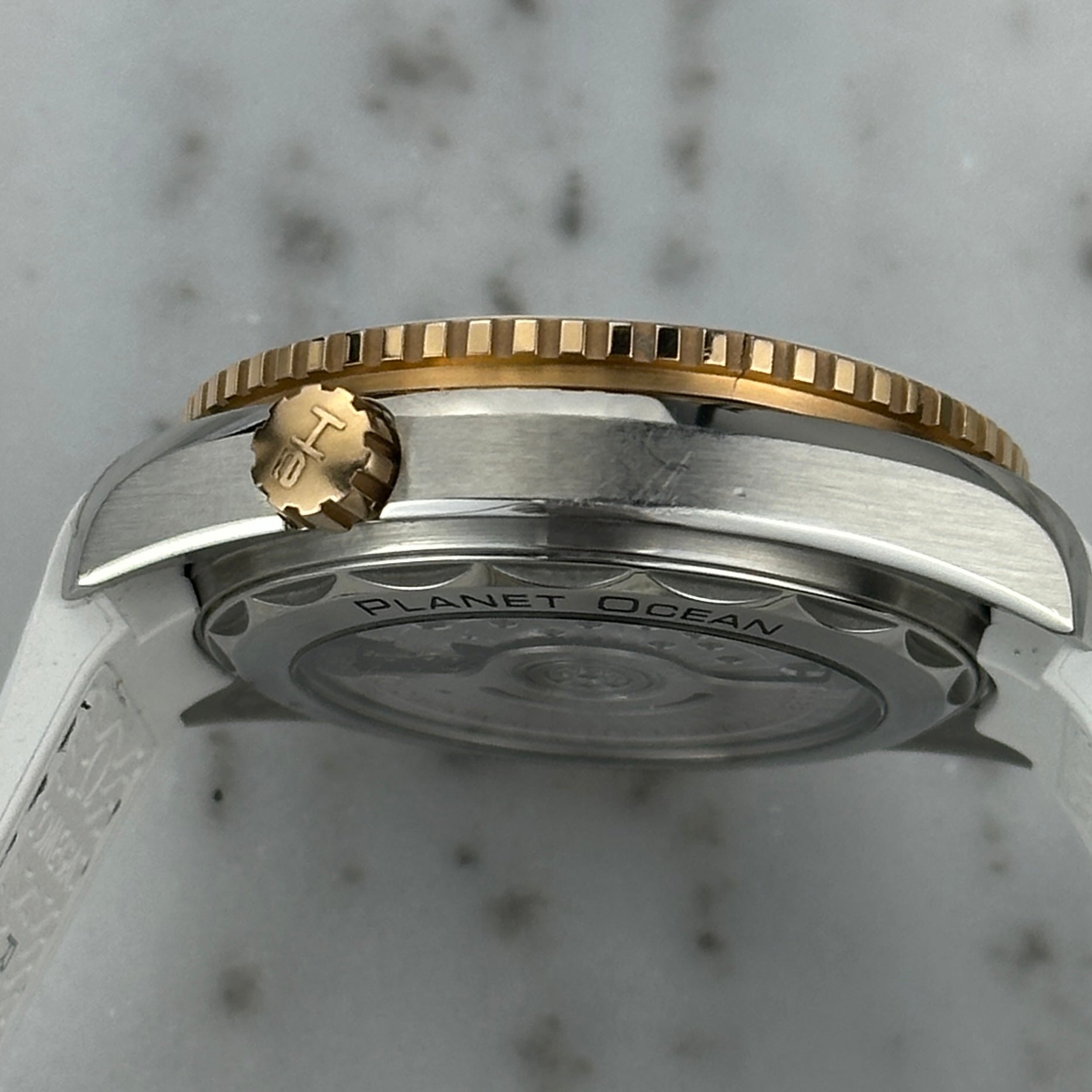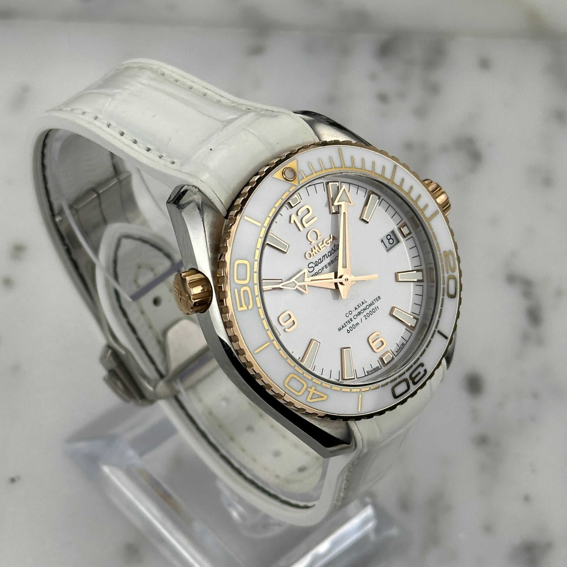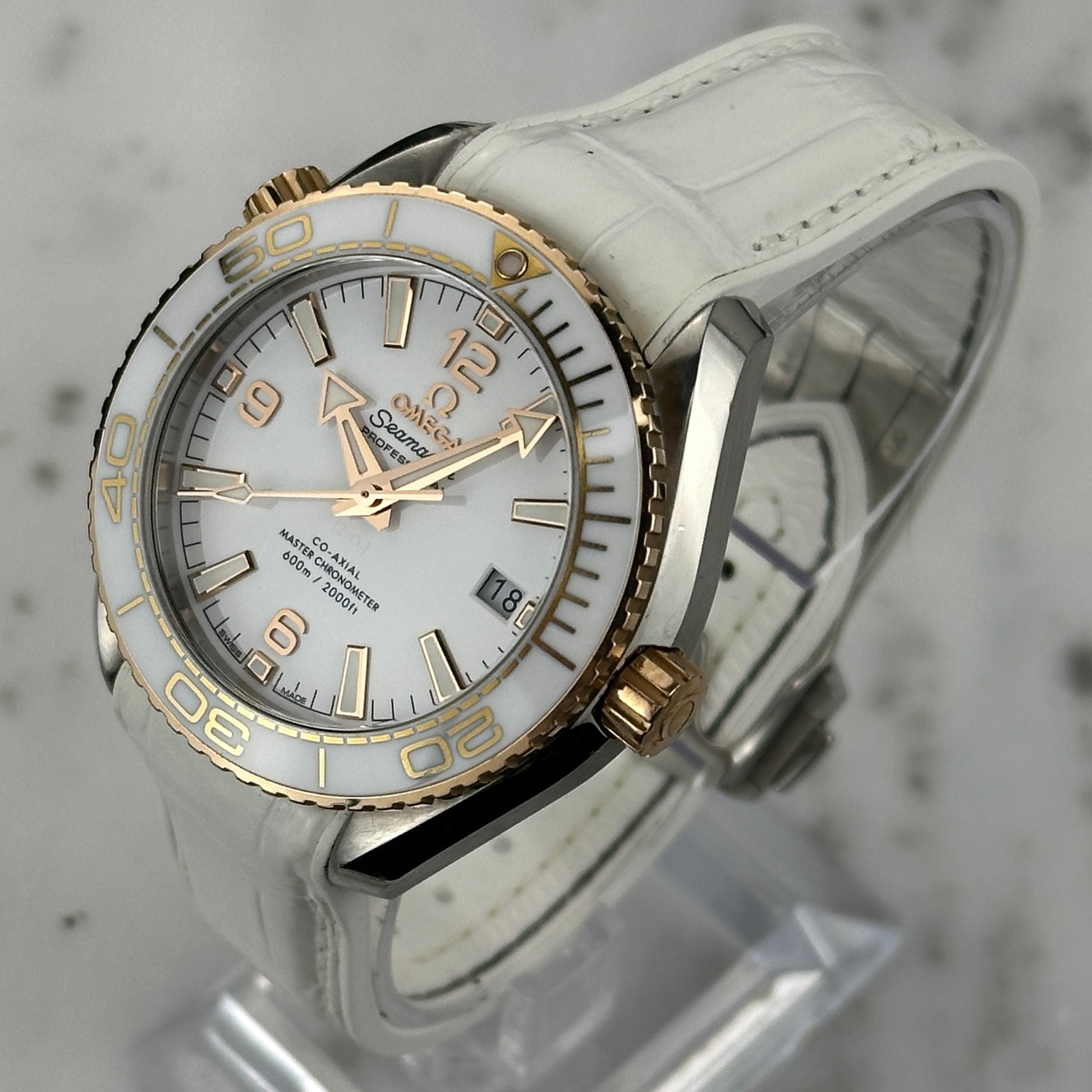The Watch: The Omega Seamaster Planet Ocean 600M 215.23.40.20.04.001 showcases Omega's ability to blend professional dive watch capability with sophisticated luxury design. This stunning two-tone model features a unique white-on-white ceramic aesthetic with warm 18K Sedna gold accents that set it apart from traditional black-dial dive watches.