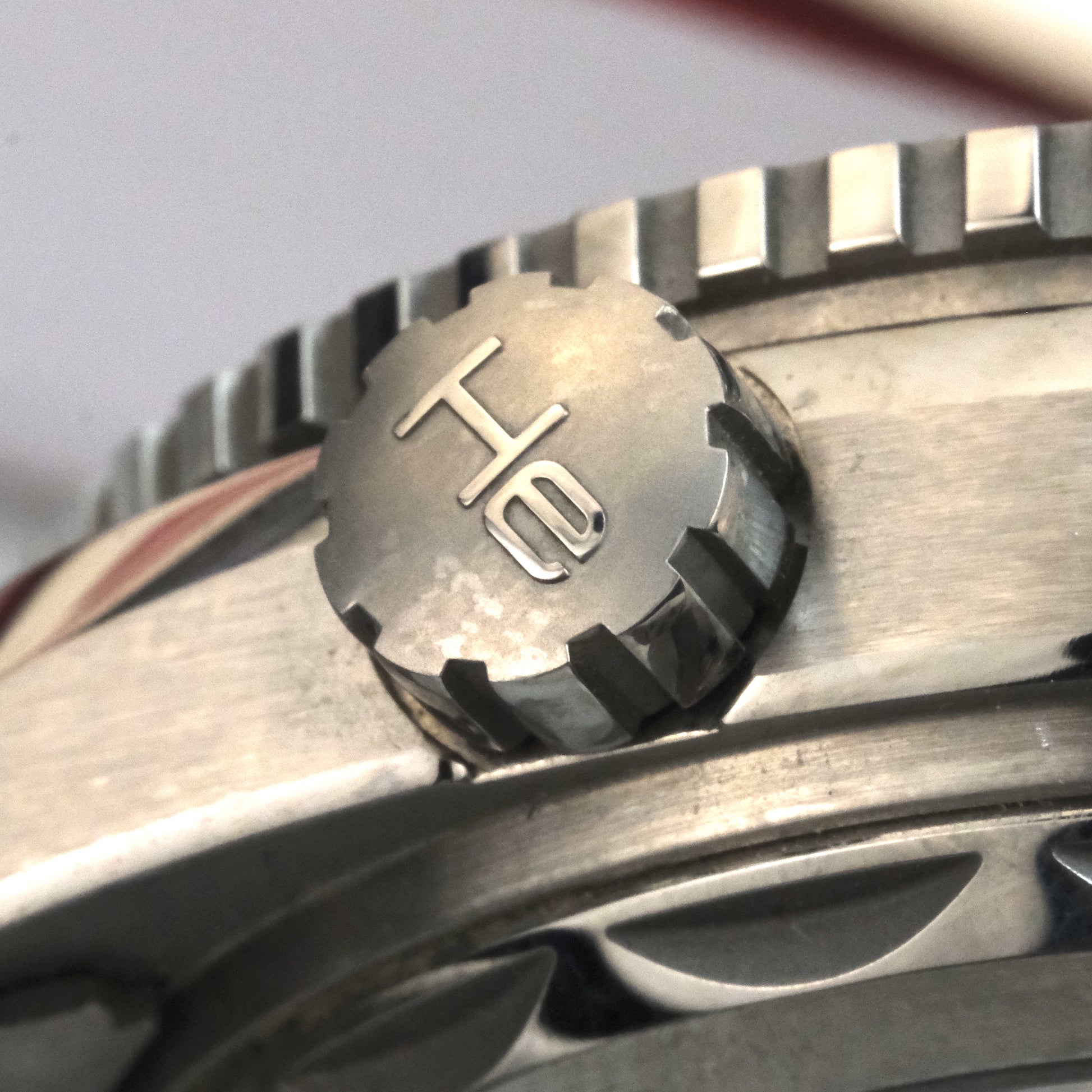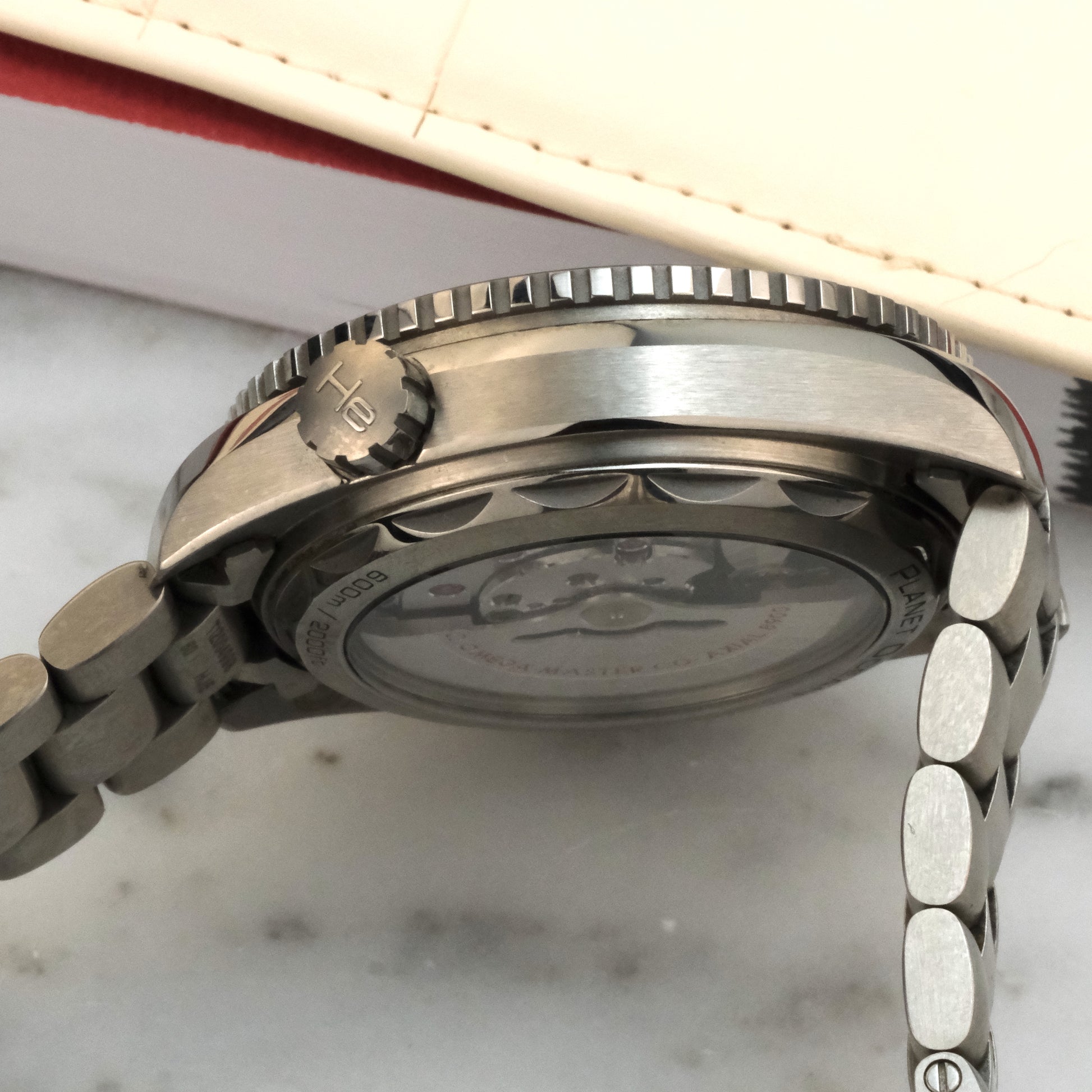 The Watch: The Seamaster Planet Ocean 600M is Omega’s boldest dive watch, and this version in full titanium elevates the design with a lightweight, ultra-durable case and bracelet. Reference 215.90.44.21.99.001 features a sandblasted titanium dial with applied indices, a matching ceramic bezel with Liquidmetal diving scale, and a helium escape valve at 10 o’clock—all the hallmarks of Omega’s most serious tool watches.