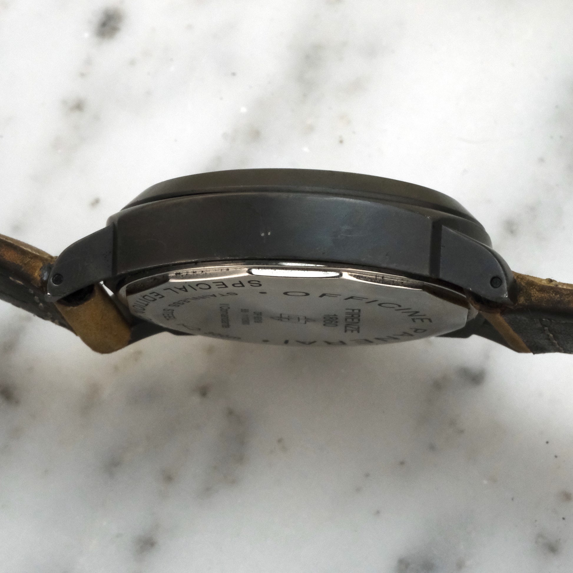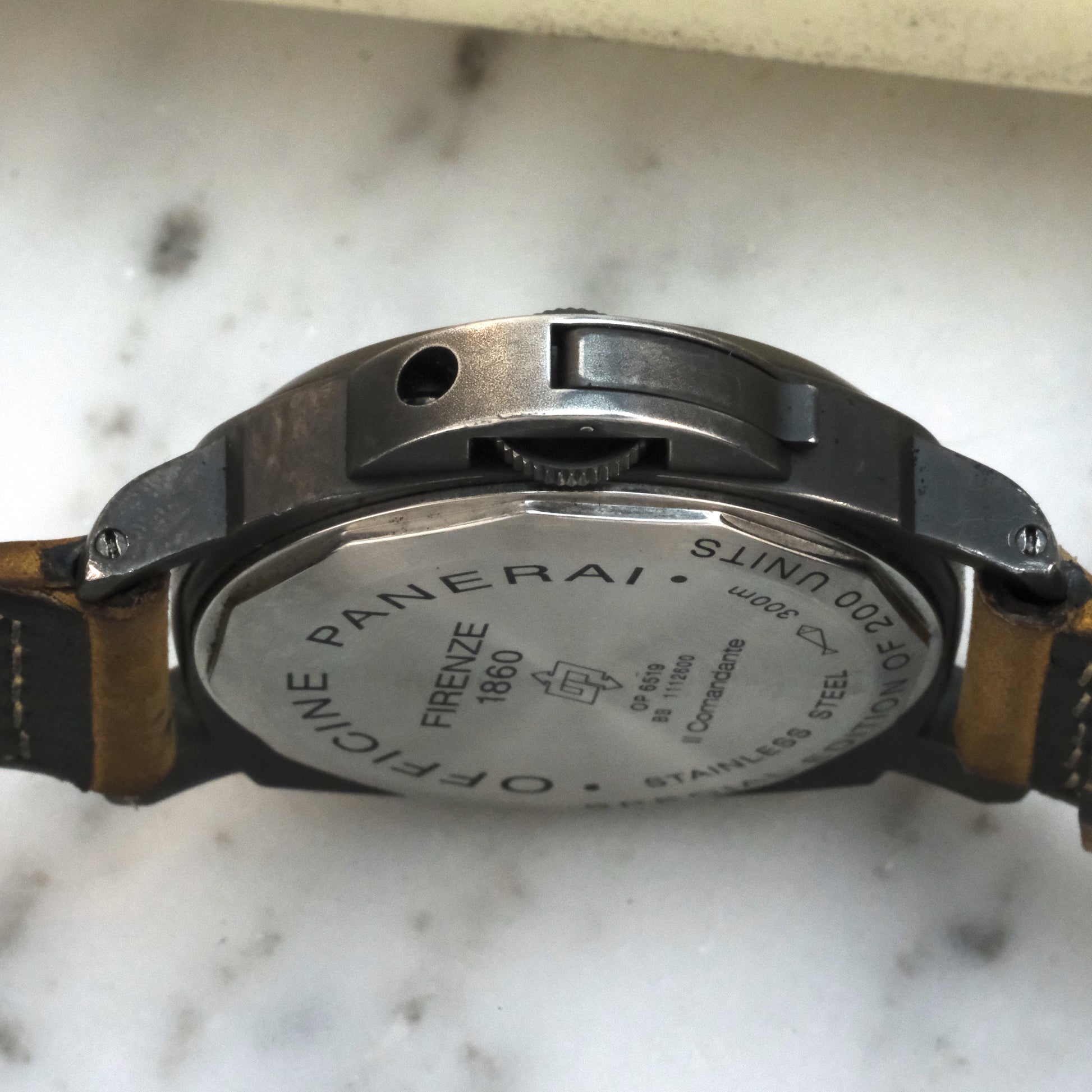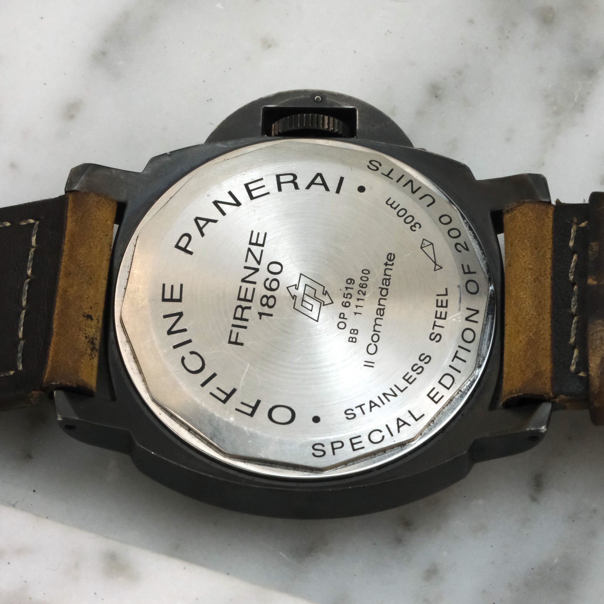 The matte black dial is accented with luminous Arabic numerals and indices, small seconds at 9 o’clock, and the discreet “Paneristi” text above 6 o’clock, a nod to the community that inspired its creation. Powering the watch is the hand-wound Panerai OP II caliber, a Unitas-based movement with 56 hours of power reserve, visible through the solid engraved caseback.