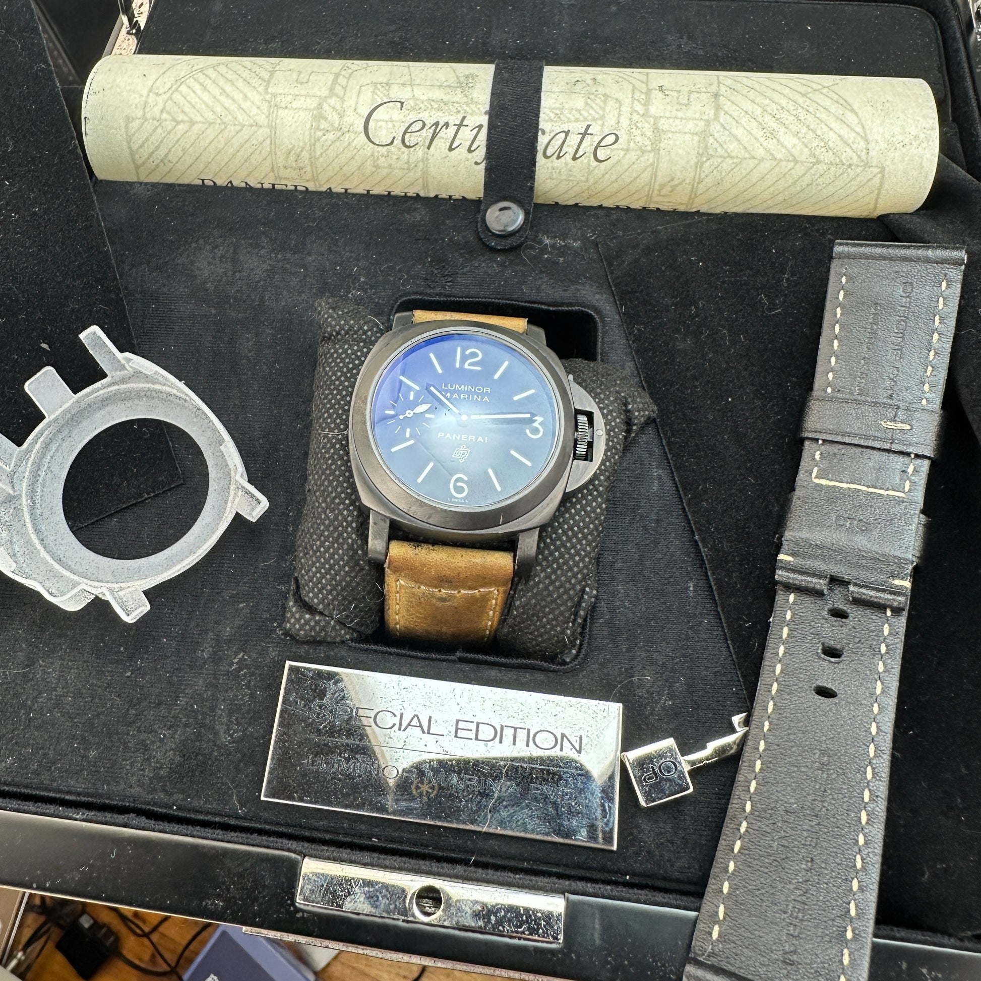 The Watch: The Panerai Luminor Marina PVD Paneristi PAM195 was created in 2003 as a limited-edition tribute to the online Paneristi community, with only 200 examples produced. Its 44mm PVD-coated stainless steel case carries the unmistakable Luminor silhouette, complete with crown-lock bridge and sandwich dial construction.