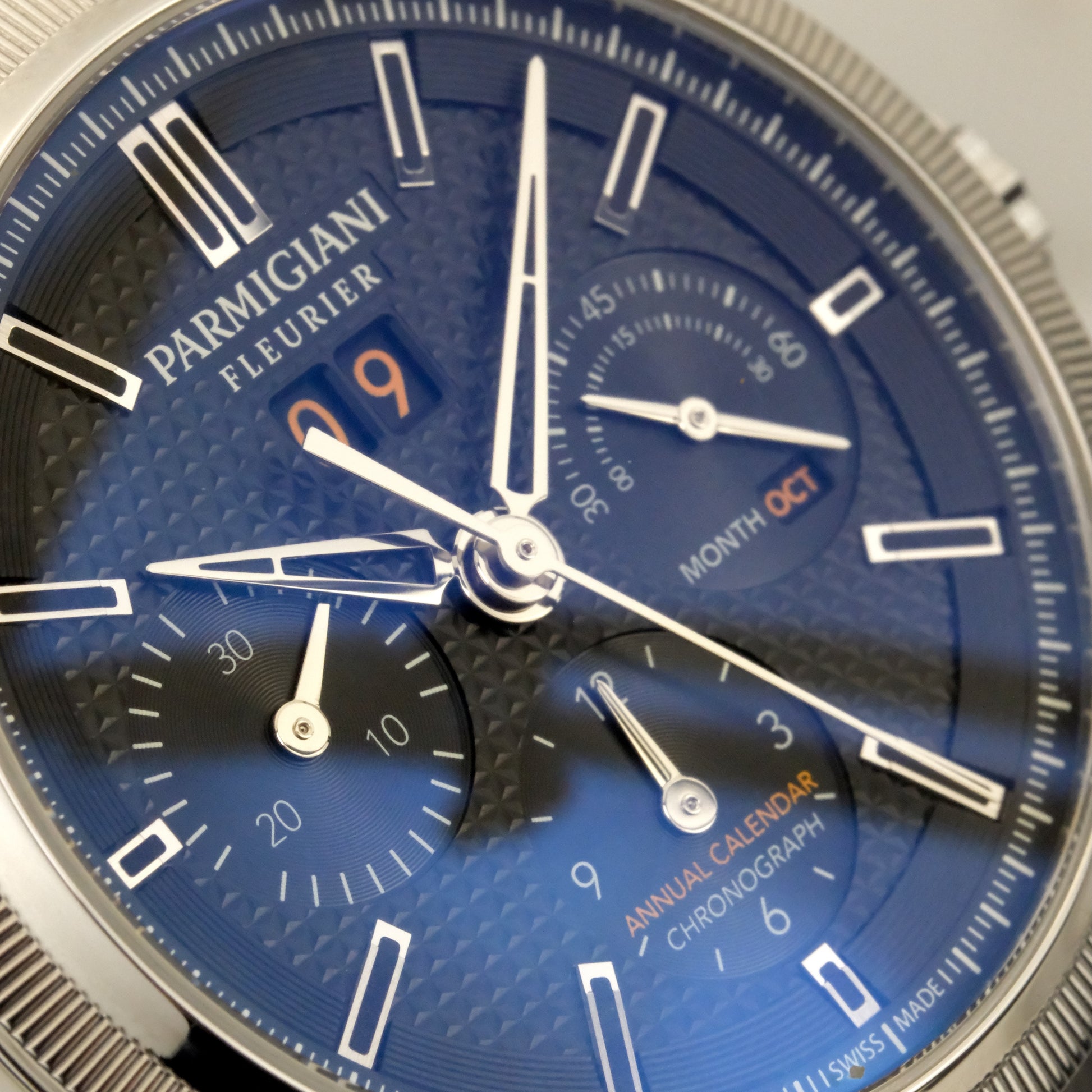 Reference PFC906-0000210-B00182 is a limited edition of 200 pieces. The dial layout speaks to Parmigiani's sense of balance: big date at 12 o'clock, chronograph registers at 6 and 9, and the month display sharing space with running seconds (and PF signature dual small seconds hand) at 3.