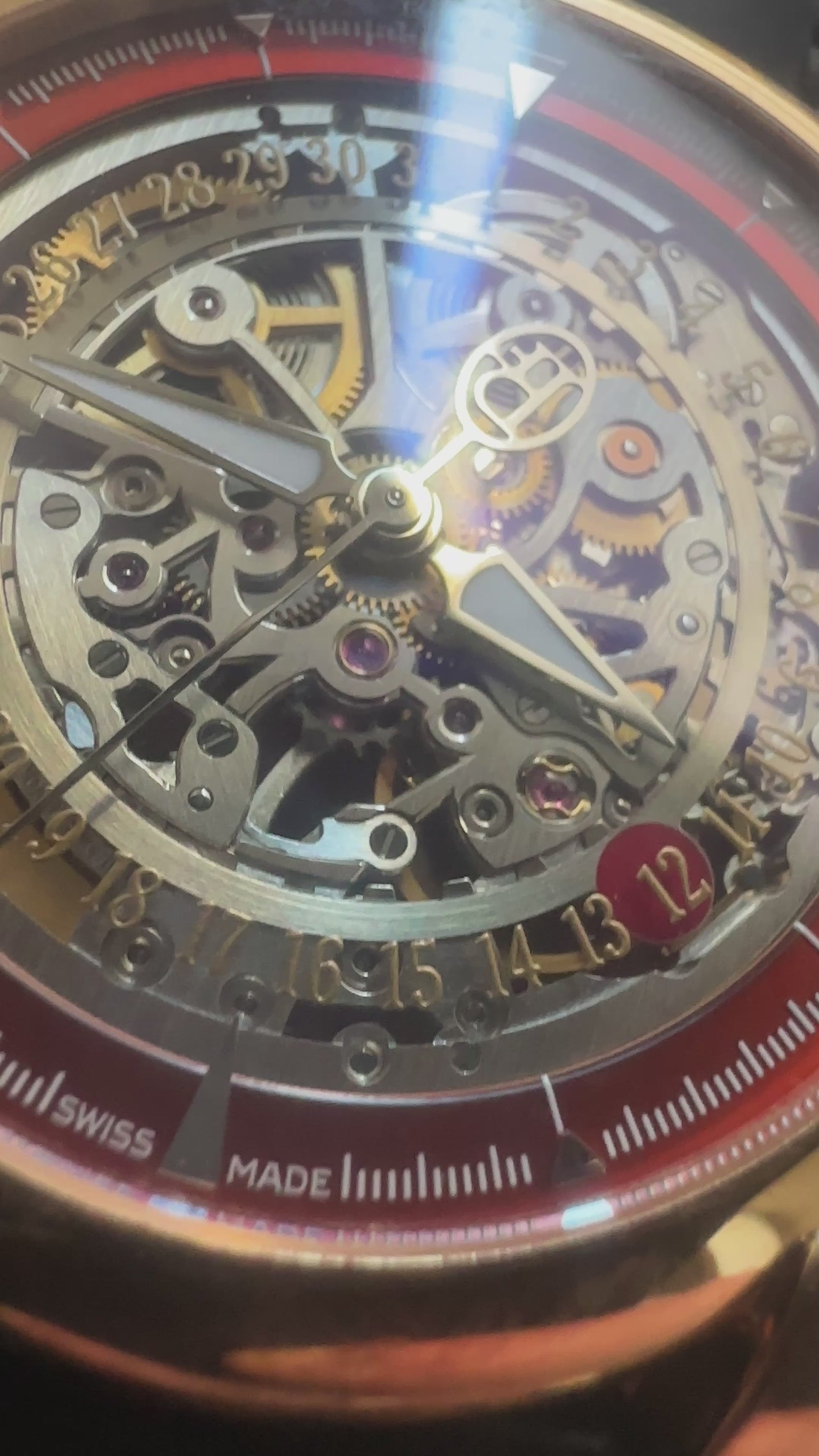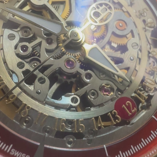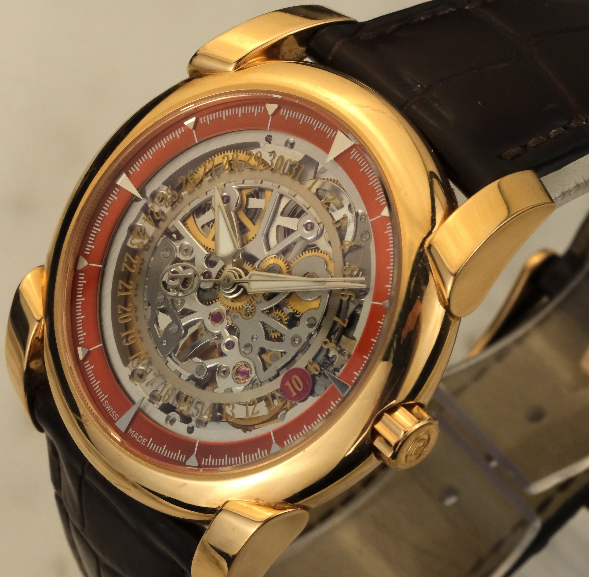 This rose gold example stands apart from standard production. A metallic red chapter ring holds the indices, and just inboard of that, a skeletonized date wheel rotates with its own matching red indicator. The movement is finished to a standard that justifies the exhibition caseback, with a skeletonized rose gold rotor providing the automatic winding. Limited to 50 pieces.