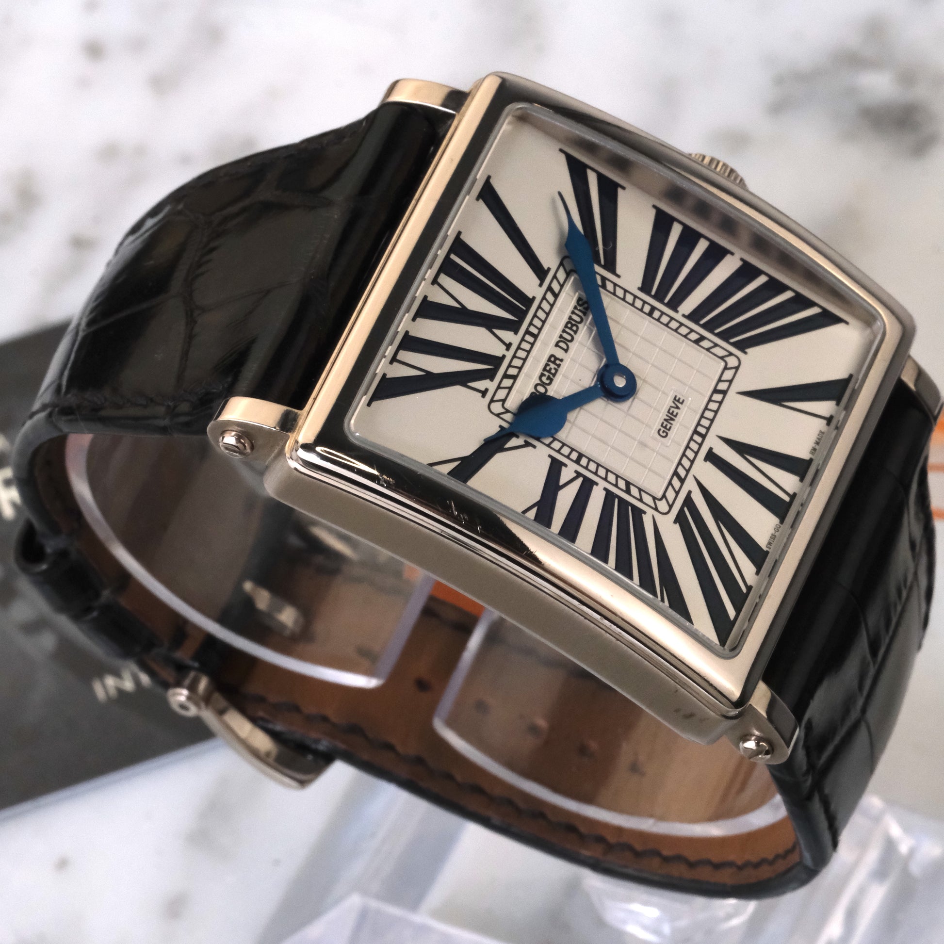 The Watch: The Roger Dubuis Golden Square is one of the maison’s boldest and most distinctive collections, embodying the dramatic design language that defined the brand in the late 1990s and early 2000s. This reference, the G40, features a 40mm square case in 18k white gold—large, but executed with Roger Dubuis’ characteristic elegance. The Roman numeral dial layout is a signature flourish, radiating from the center and emphasizing the geometry of the case.