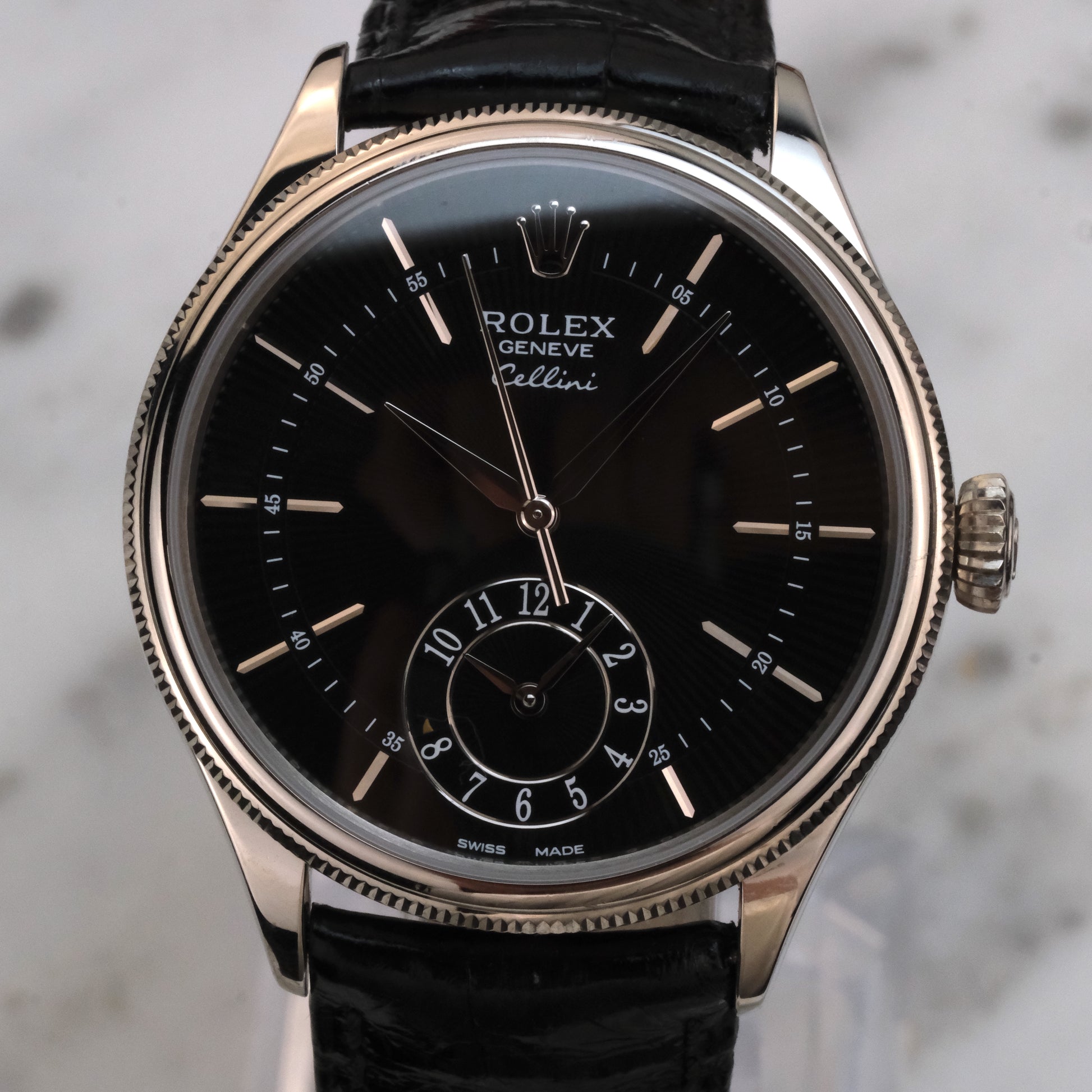 The Watch: The Rolex Cellini Dual Time Ref. 50529 brings classic Geneva dress watch sensibility to the modern Rolex catalog. Crafted from 18k white gold, the 39mm case features polished fluted edging, sleek lugs, and a slim profile. The black dial has a sharp guilloché pattern and applied baton indices and Rolex crown. A second time zone subdial at 6 o’clock with a clever day/night indicator completes the layout.