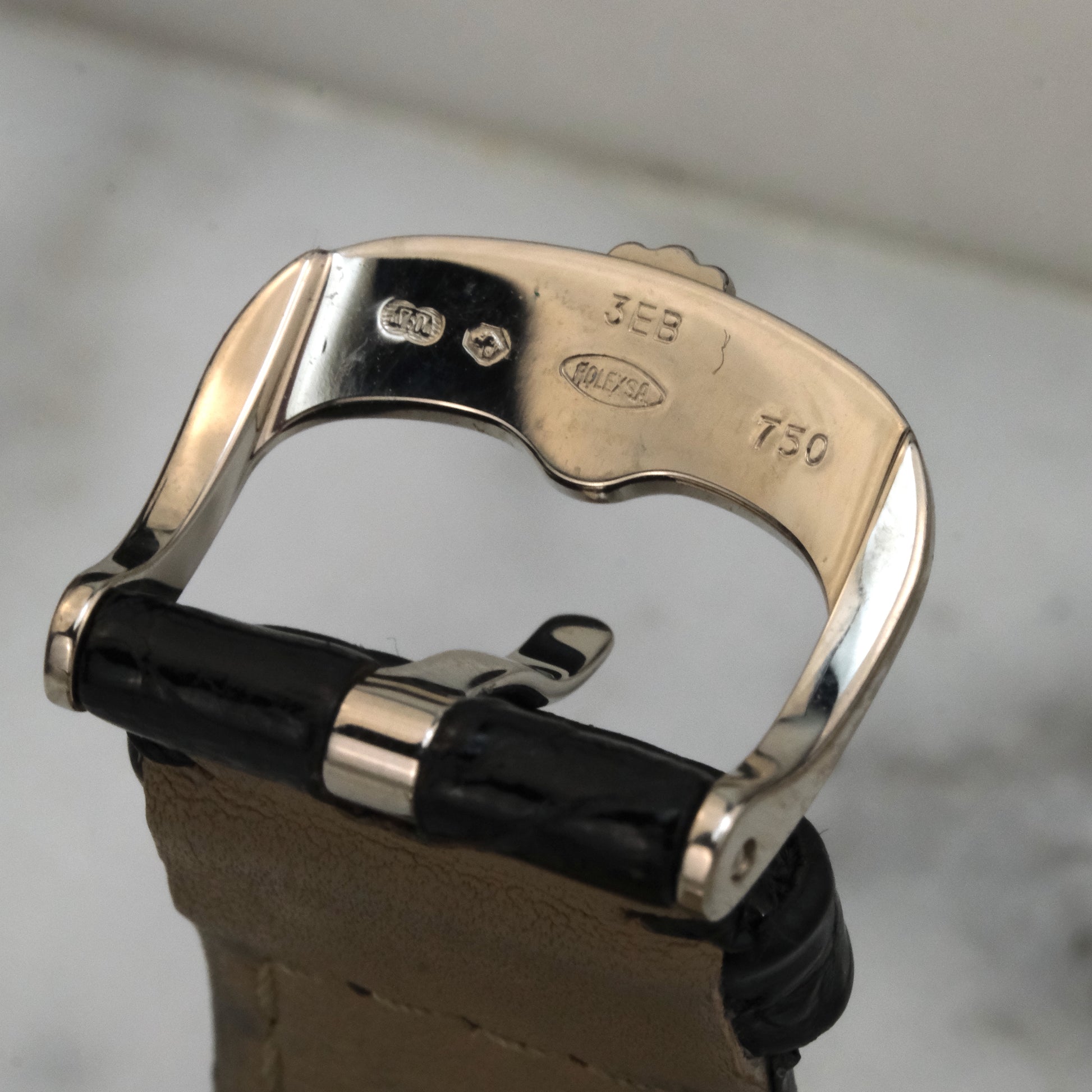 Powered by the Rolex Caliber 3180, the movement is a COSC-certified chronometer and features hacking seconds, 48-hour power reserve, and dual time functionality. The watch is paired with its original black alligator strap and signed white gold buckle.