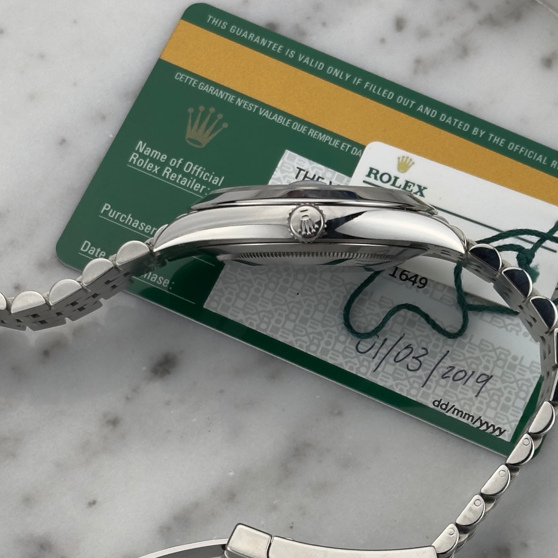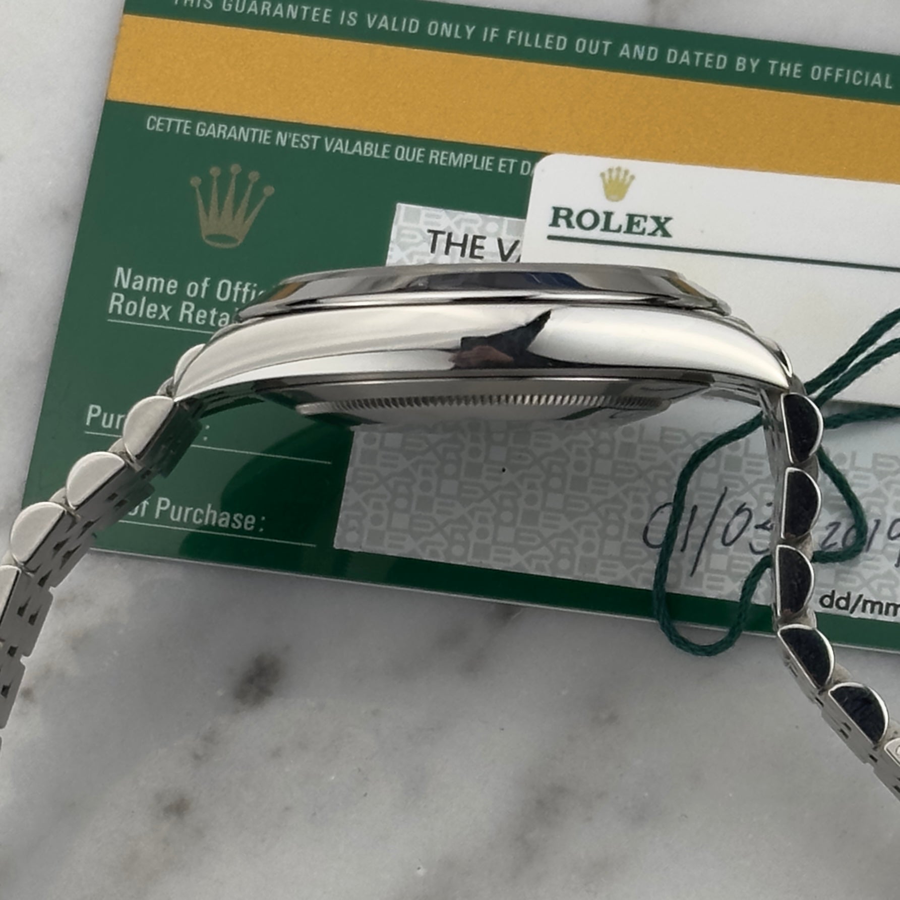 This 2019 example wears on a Jubilee bracelet, the five-link design that Rolex introduced alongside the original Datejust. Currently sized for a 7.75" wrist with two links removed.