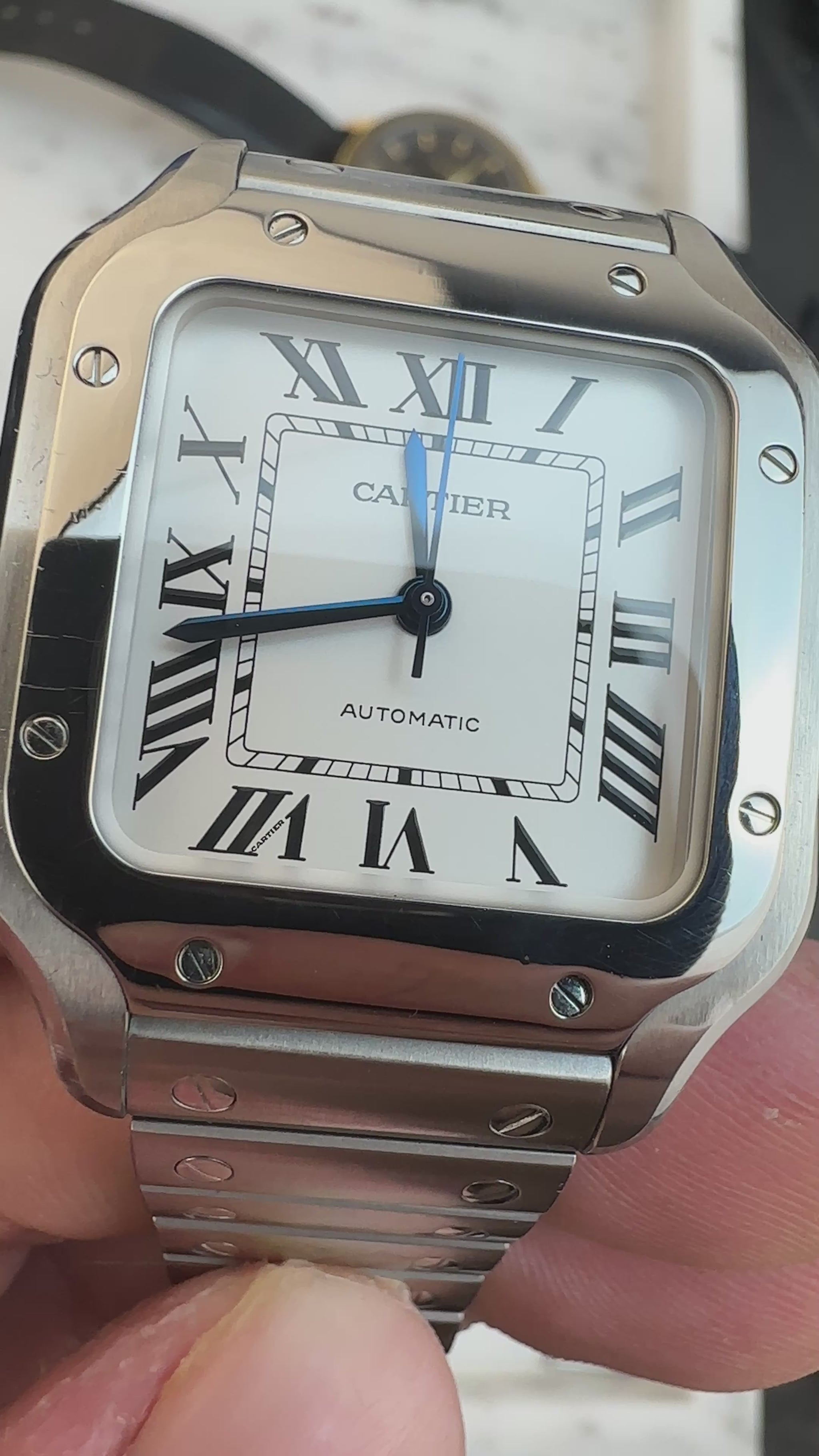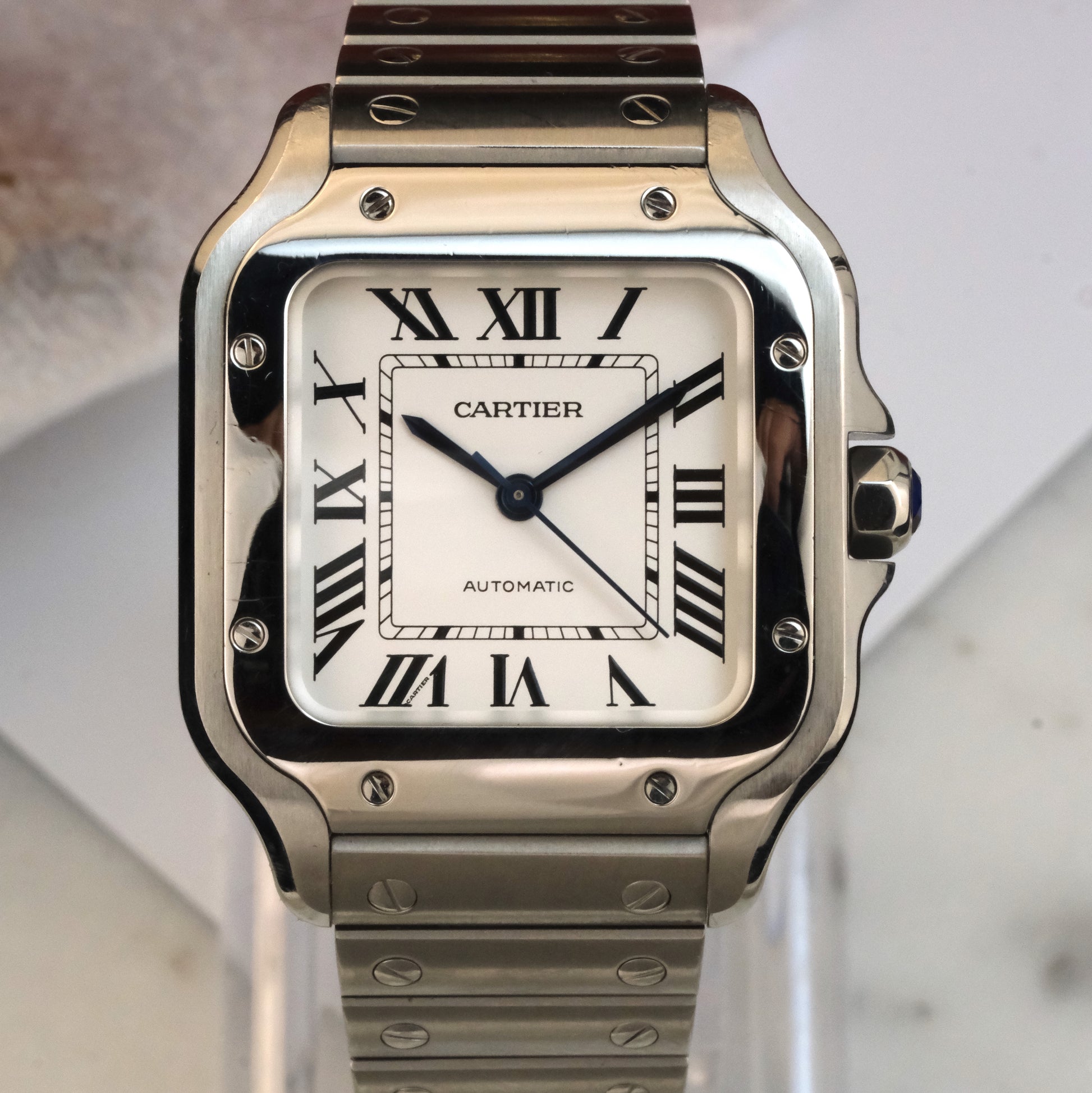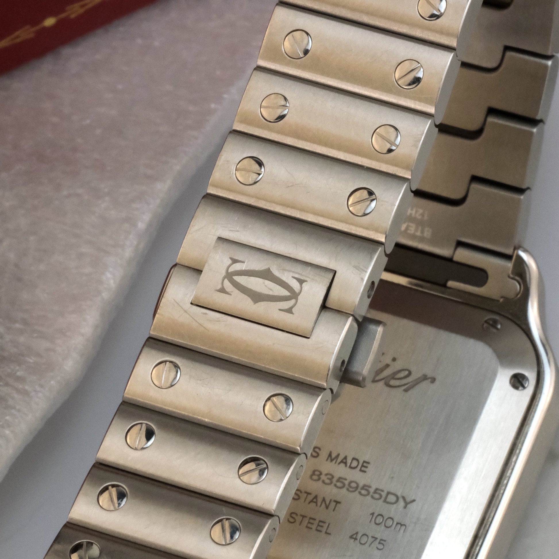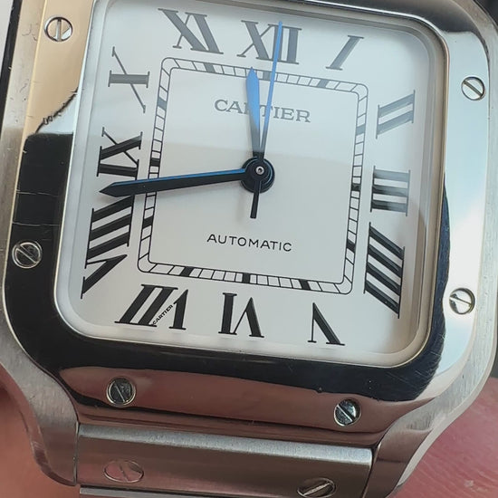 The Watch: This is a Santos de Cartier WSSA0029, medium, steel, full kit.