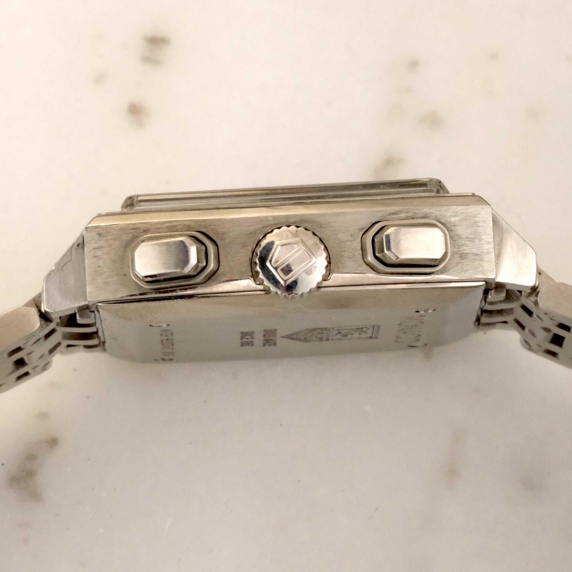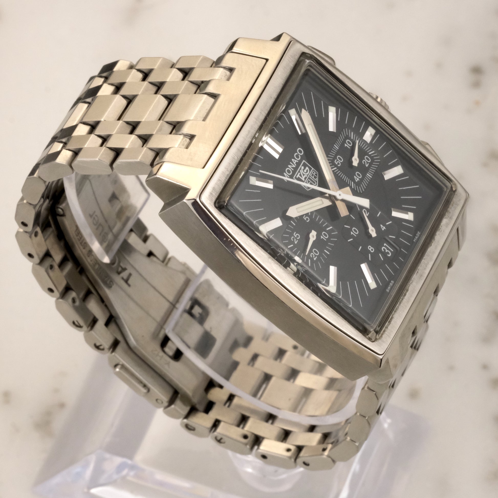 The automatic chronograph movement inside delivers reliable performance, while the sapphire crystal and solid steel bracelet give the piece modern durability. The square case and short lugs make it wearable for a wide range of wrists, and this example’s bracelet fits up to 6.75".
