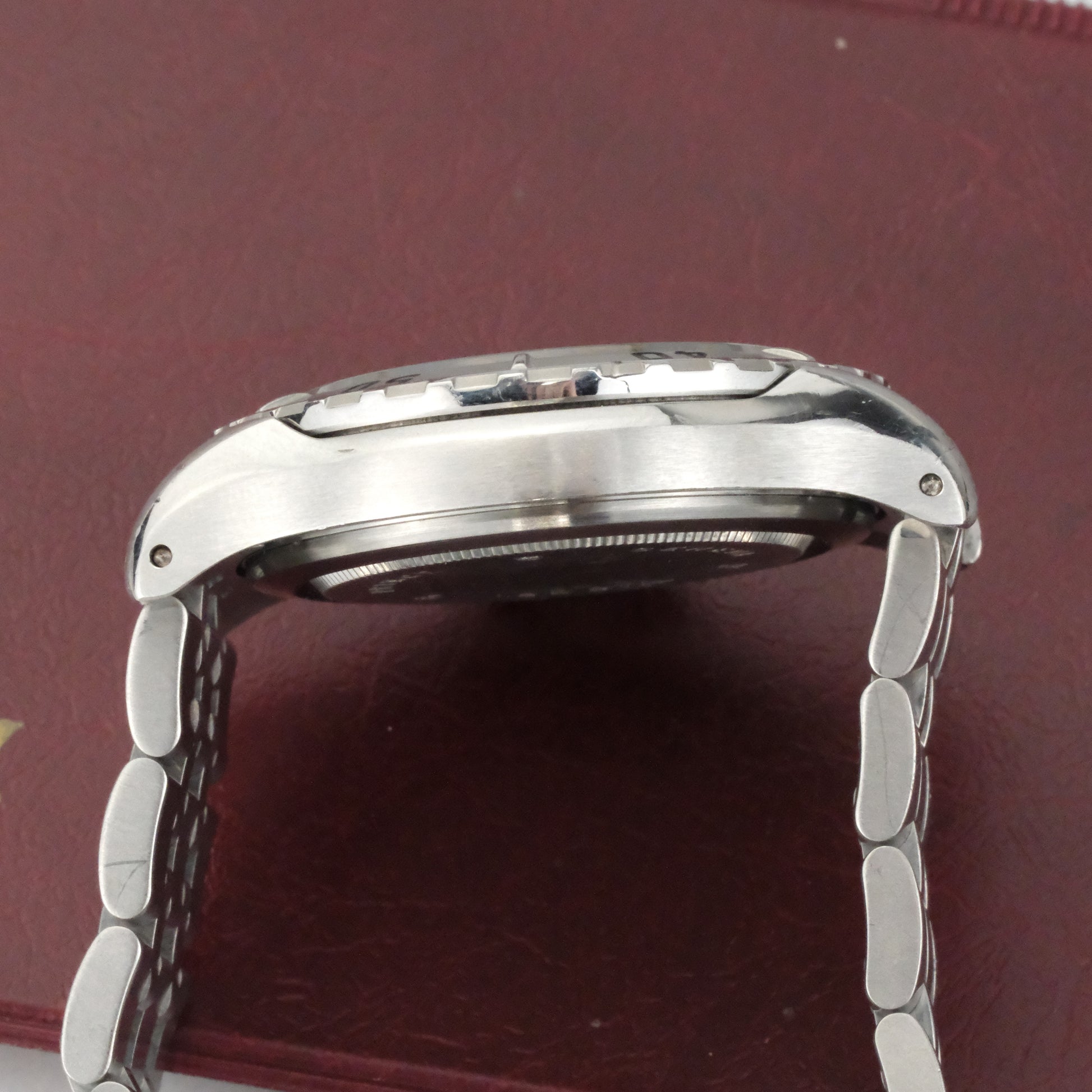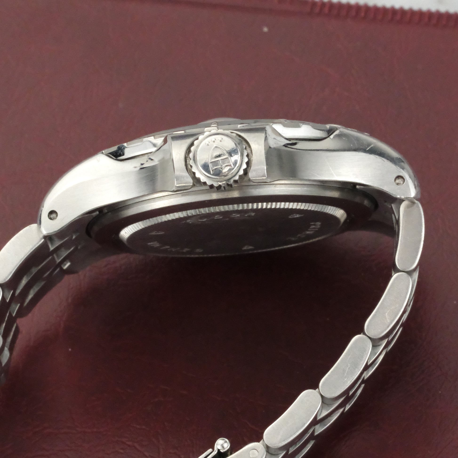 The 89190 is the full-size version: 40mm in stainless steel, 200m water resistance, and a surprisingly slim 11mm profile. The bezel is sharply knurled with a frosted aluminum insert, and the crown guards curve out with almost organic detail. On the wrist, it wears flatter and more refined than most tool watches of the era.